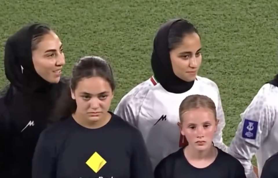 首场小组赛,伊朗女足对阵韩国队。赛前例行的唱国歌环节,伊朗队的所有球员(包括主力+替补)均没有唱国歌。期间,有些球员还露出了笑容,另有一些人眼含泪水。场下,伊朗队的主帅贾法里同样面露微笑。